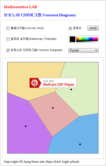 Å×¼¿·¹À̼ǰú´Â ¶Ç ´Ù¸¥ ¼öÇÐÀû ¹æ¹ýÀ¸·Î Æò¸éÀ» °¡µæ ä¿ì´Â º¸·Î³ëÀÌ(Voronoi) ´ÙÀ̾î±×·¥ ÀÔ´Ï´Ù. ÀÛµµÀÇ ¿ø¸®¿Í Ȱ¿ëºÐ¾ß´Â º» ½ÇÇè½Ç »ó´ÜÀÇ ¸µÅ©¸¦ Âü°íÇϽñ⠹ٶø´Ï´Ù. Á¡(Locator, ·ÎÄÉÀÌÅÍ)ÀÇ °³¼ö¸¦ Ãß°¡ÇÏ´Â ¹æ¹ýÀº Űº¸µå ALT+Click ÀÔ´Ï´Ù. Áï, ALT¸¦ ´©¸¥ »óÅ¿¡¼ ¸¶¿ì½º¸¦ Æò¸é»óÀÇ ¿øÇÏ´Â À§Ä¡¿¡ ³õ°í Ŭ¸¯(CLick)Çϸé Ãß°¡ÇÒ ¼ö ÀÖ½À´Ï´Ù. ¹Ý´ë·Î ƯÁ¤ÇÑ Á¡(Locator, ·ÎÄÉÀÌÅÍ) À§¿¡ ¸¶¿ì½º¸¦ ¿Ã·Á³õ°í ALT+Click ÇÏ¸é »èÁ¦µË´Ï´Ù.